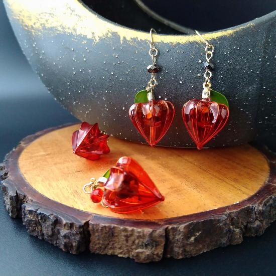 ディップアートで作った ほおずきモチーフの耳飾り。